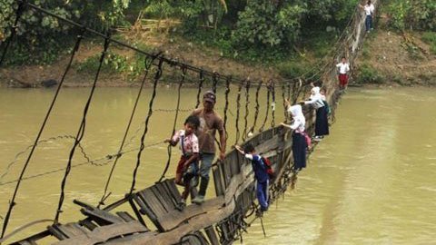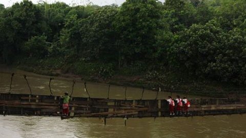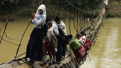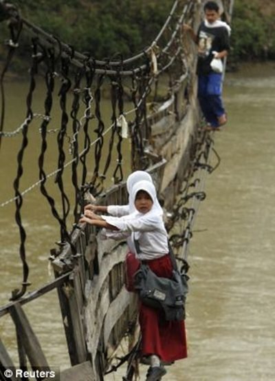 Vắt vẻo trên cây cầu treo đã bị đứt một bên dây văng, những đứa trẻ chỉ chừng năm, sáu tuổi như phó mặc cả tính mạng của mình cho dòng sông Ciberang mỗi lần tới trường.