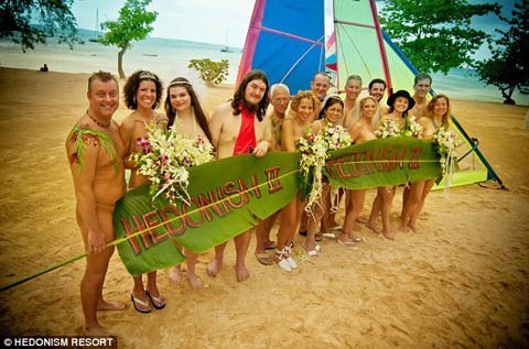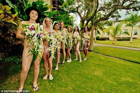 Chỉ với một bó hoa lan trắng trên tay để che đi những phần nhạy cảm, những cô dâu sải bước trên bờ biển cát trắng để tới nơi tổ chức lễ cưới của mình tại khu nghỉ dưỡng Hedonism.