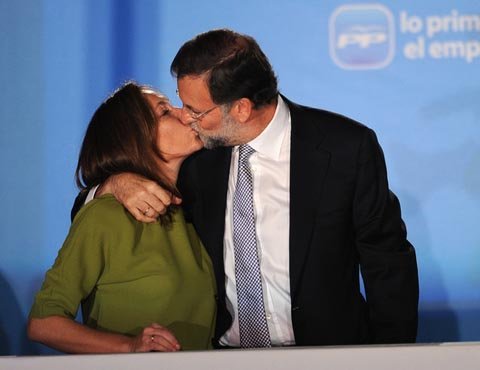 Nụ hôn mừng chiến thắng của vợ chồng thủ tướng Tây Ban Nha Mariano Rajoy và phu nhân Elvira. (Ảnh: Getty Images)