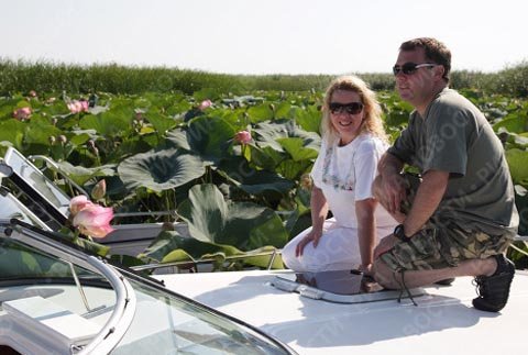 Phút thư giãn của vợ chồng tổng thống Nga Dmitry Medvedev và bà Svetlana trên sông Volga. (Ảnh: rian.ru)