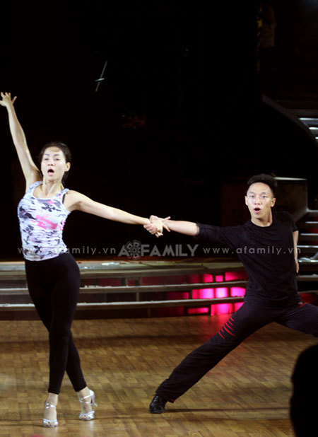 Không xuất hiện cùng bạn nhảy điển trai Lachezar Stefanov Todorov trong buổi tập tổng duyệt chiều 14/5 tại nhà thi đấu Quần Ngựa, Thu Minh say sưa luyện tập cùng một bạn diễn hoàn toàn mới người Việt Nam.