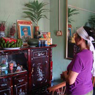 | Bà Túc đau buồn bên di ảnh người chồng xấu số |