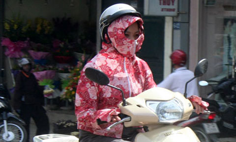 | Người Hà Nội bịt kín khi di chuyển trên đường trong thời tiết nắng nóng gay gắt. |