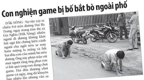 Sự việc xảy ra chiều 9/6 trên đường Hai Bà Trưng, ngay trung tâm thị xã Gia Nghĩa (Đắk Nông), nhiều người đi đường không khỏi bất ngờ khi chứng kiến cảnh người cha ngồi trên xe máy luôn miệng la mắng và bắt hai đứa con của mình bò trên đường. Ông này phân trần với mọi người rằng ông phạt con vì bắt quả tang con đang chơi game. Hai đứa thường chơi game cả ngày, ông đã khuyên bảo nhiều lần nhưng vẫn sa vào game, lơ là học tập. Để dạy con, ông bắt hai con bò trên quãng đường hơn 500m. Chỉ đến khi có nhiều người khuyên thì người cha này mới dừng việc dạy con. |