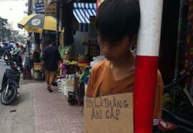 Ngày 17/6, trên đường Âu Cơ (Tân Bình, TP.HCM) có một thiếu niên đeo tấm bảng ghi dòng chữ “Tôi là thằng ăn cắp” đã thu hút sự tò mò của rất nhiều người qua đường. Cậu bé này là N. (13 tuổi, quê Hải Dương). Hình phạt trên là do anh Kha, là chú ruột cậu bé, đưa ra.