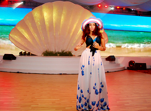 Biểu diễn ở vị trí vedette trong đêm tiệc "Summer Break" tối 23/6, Vũ Thu Phương là tâm điểm chú ý của khán giả khi cô để lộ cặp tuyết lê tròn căng, đầy quyến rũ trong trang phục dạo biển mỏng manh.
