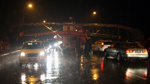 Khoảng 19h tối qua (29/6), trận mưa to đã khiến cổng chào được dựng trong đợt Đại lễ 1.000 năm trên đường Lạc Long Quân, Hà Nội đổ xuống, gây cản trở giao thông.