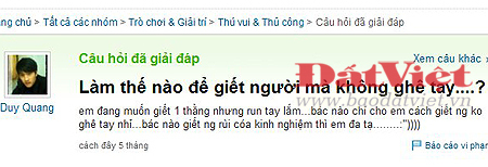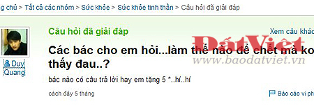 Trong số đó, có hai câu hỏi có nội dung rất đáng sợ như sau: “Làm thế nào để giết người mà không ghê tay....?”“Các bác cho em hỏi... làm thế nào để chết mà không thấy đau?”.