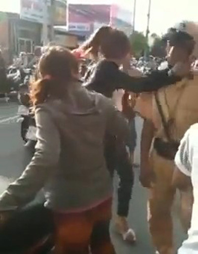 | Mỹ Linh liên tiếp tát vào mặt CSGT (Ảnh chụp từ clip) |