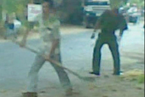 | Đối tượng Nguyễn Văn Tâm hung hăng cầm xẻng lao vào tấn công tổ CSGT (ảnh do người dân chứng kiến cung cấp - theo Zing) |
