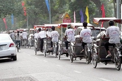 | Xích lô đi thành hàng dài gây cản trở giao thông ở Hà Nội. Ảnh: Xuân Tùng |