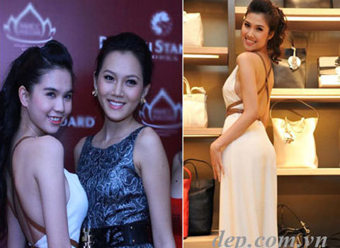 | Hai chiếc váy được mặc bởi Ngọc Trinh và Thu Hằng với phần cổ gần giống hệt, chỉ khác ở chi tiết dây vai ? |