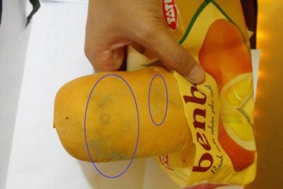 Bác Oanh cho biết: Chiều ngày 1/8, bác có vào siêu thị Fivimart trên đường Hoàng Quốc Việt để mua 03 gói bánh mỳ Banbơ mặn, nhân pho mát cho cháu nhỏ ăn và một số vật dụng gia đình khác. Trên gói bánh mỳ có ghi rõ hạn sử dụng từ 22/7/2011 đến ngày 01/08/2011, vỏ bao bì vẫn phồng căng như bình thường. Tuy nhiên, ngay khi đem về nhà, buổi tối hôm đó, lúc bóc bánh ra cho cháu ăn thì bác ngạc nhiên phát hiện: Bánh đã mốc xanh từ bao giờ. Hai bề mặt bánh nhuốm một màu đen ngòm vì mốc thay vì màu vàng nhẹ thơm ngon, bắt mắt.