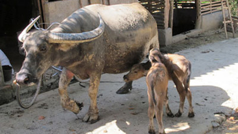 | Con trâu sinh tới 2 con nghé ở gia đình ông Hoà(Ảnh: Dân Trí) |