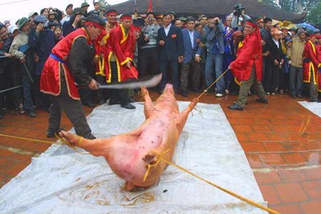 Được đăng tải trên Youtube cách đây ít ngày, đoạn clip ghi lại cảnh một chú lợn sống bị lật ngửa, bốn chân bị trói và banh ra bốn phía, được rước vào sân đình giữa một đám đông cuồng nhiệt. Sau khi thực hiện một số động tác nghi lễ, một người đàn ông cầm lưỡi dao dài chém ngang bụng lợn 3 lần làm chú lợn bị xẻ làm đôi, máu xối ra lênh láng, nhuộm đỏ một mảng sân trong tiếng reo hò của đám đông. Trong số những người chứng kiến cảnh tượng này có cả trẻ em…