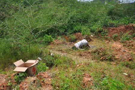 Thi thể được phát hiện là người đàn ông, chết trong tư thế quỳ gối giữa bãi đất, mặt cắm xuống đất nơi máu đọng thành vũng. Trên người nạn nhân mặc quần ngắn, áo thun trắng sọc ngang.