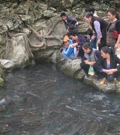 Chúng tôi mua một ít rau và bỏng ngô để “làm quen” cá. Đàn cá ở đây rất “dạn” người, thấy thức ăn là tung lên đớp, thậm chí đớp cả thức ăn trên tay người. Khách du lịch ít dám nghịch hay vớt cá mà thường đứng trên bờ ngắm hoặc chụp ảnh.