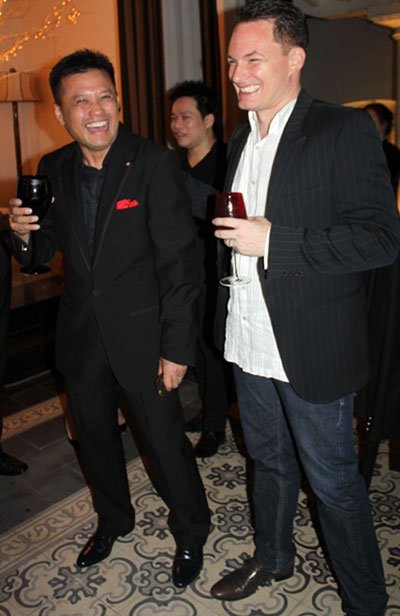 | Doanh nhân Huỳnh Nam (trái, chồng của Hà Kiều Anh) chuyện trò rôm rả cùng chồng của ca sĩ Hồng Nhung. (Ảnh: Vnexpress) |
