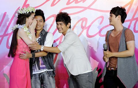 | Nhóm V.Music và các fan lên tặng quà khiến Hà Hồ rất xúc động (Ảnh: Bưu Điện Việt Nam) |