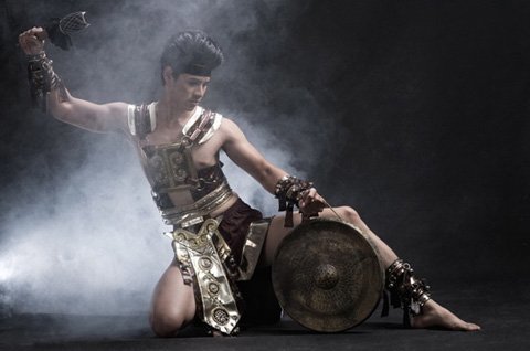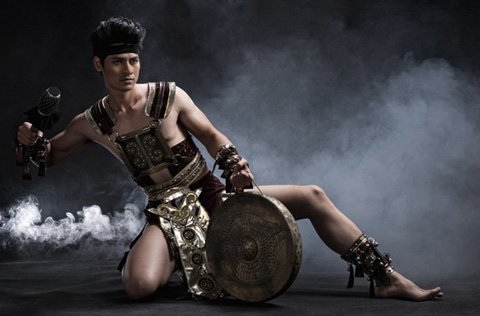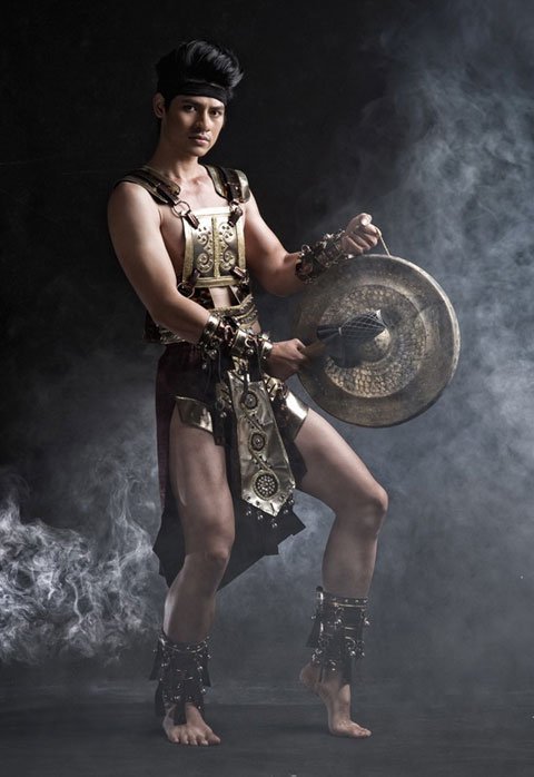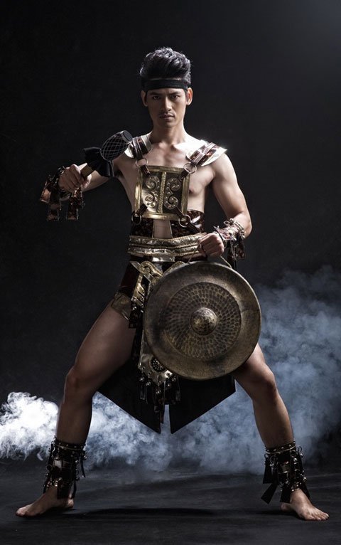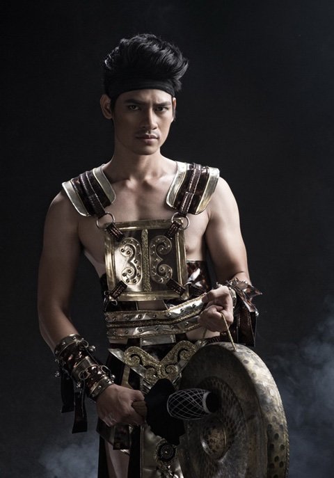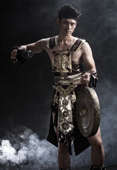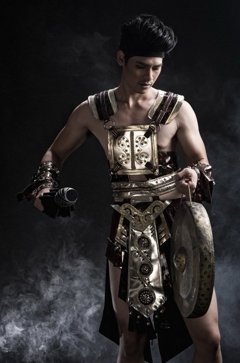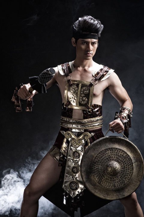 Mister Việt Nam Lê Khôi Nguyên tự tin khoe sự dũng mãnh của đàn ông Việt trong bộ trang phục dân tộc. Đây cũng là trang phục anh sẽ mang đi dự thi Mister thế giới 2011 tại Thái Lan