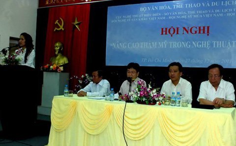 | Từ trái qua: Ca sĩ Thanh Thúy phát biểu ý kiến và PCT Hội Nghệ sỹ Việt Nam – CT Hội Âm nhạc TP.HCM – nhạc sỹ Trần Long Ẩn, Cục trưởng Cục Nghệ thuật biểu diễn - NSƯT Vương Duy Biên, PGĐ Sở VH-TT&DL TP.HCM Võ Trọng Nam, CT Hội Nghệ sỹ sân khấu - NSND Lê Tiến Thọ chủ trì hội nghị |