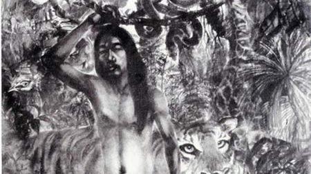 ông khỏa thân giữa thiên nhiên với các động vật và chỉ sử dụng màu đen trắng với