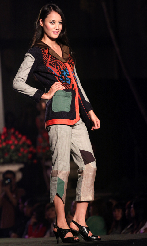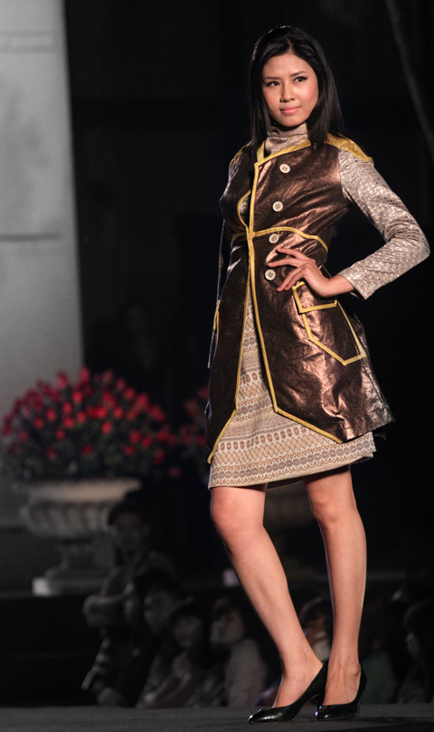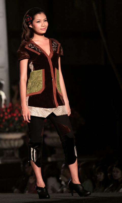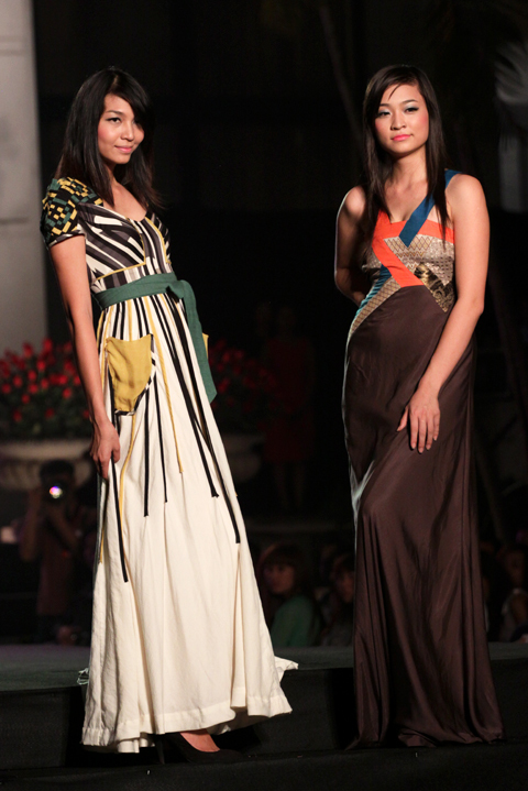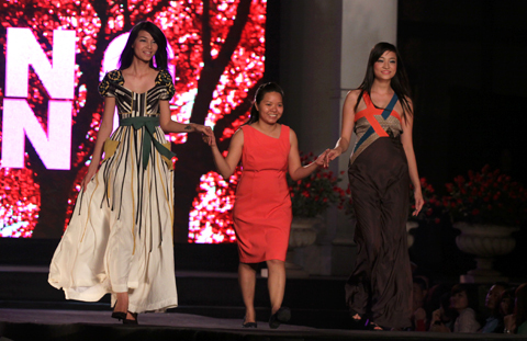 Màu sắc chủ đạo của đêm đầu tiên là gam trầm được nhấn mạnh bởi những đường xẻ lạ hoặc sự thướt tha bởi chiếc váy dài. Riêng BST của NTK Hồng Dung vẫn dựa trên gam trầm đó nhưng nổi bật với họa tiết hoa văn màu sắc được trang trí và kết hợp trong sự sáng tạo phá cách độc đáo