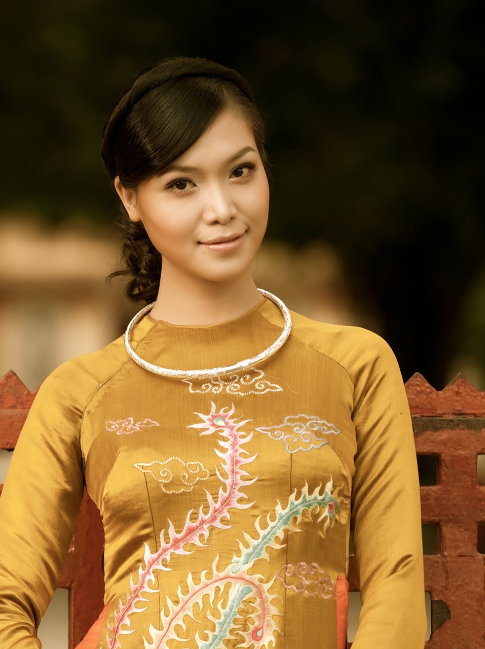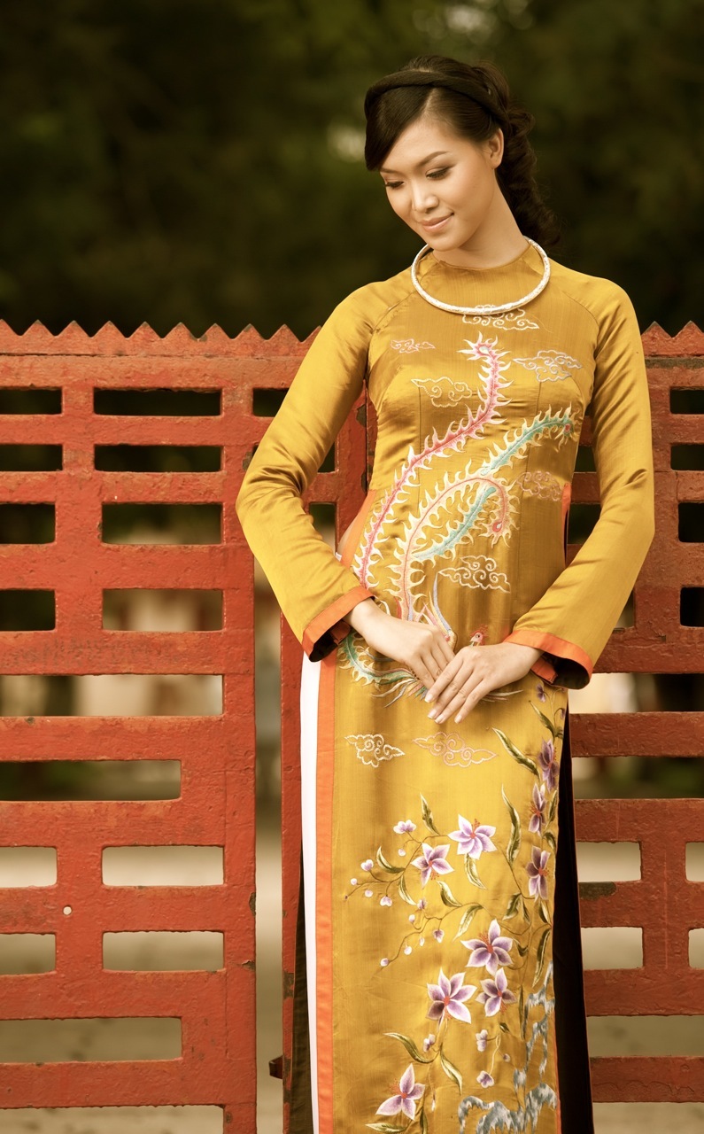 Chiếc áo dài truyền thống của phụ nữ Việt được NTK Đức Hùng thêu lên những hình thêu tinh xảo hình chim phượng trên nền màu vàng đồng, thể hiện sự sang trọng, quý phái, màu sắc cung đình lộng lẫy.
