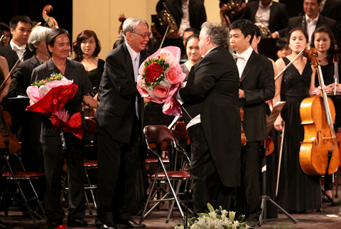 Nhạc sĩ Trọng Bằng lên tặng hoa và bắt tay nhạc trường Lior Shambadal
