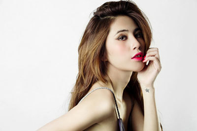 Ca sĩ Thủy Tiên với hình xăm ngôi sao ở tay. Cô còn một hình xăm thiên thần ở sống lưng