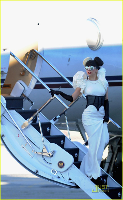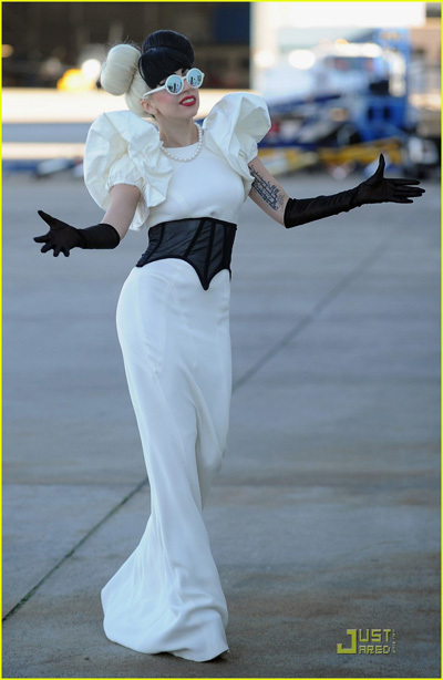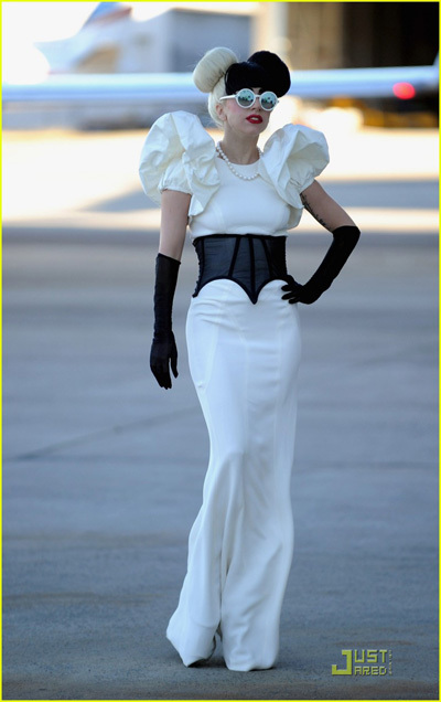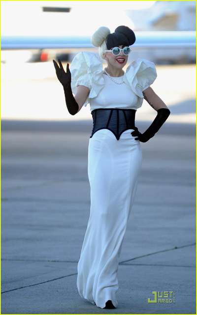 Để gây ấn tượng thêm, Lady Gaga chọn một cặp kính tròn với gọng màu trắng. Kiểu tóc này không ăn nhập cho mấy với bộ đầm dài cô mặc vốn chỉ thích hợp với các bữa tiệc hoặc sự kiện sang trọng hơn là khi di chuyển bằng máy bay. Tuy nhiên, so với những lần xuất hiện khác thì kỳ này gu ăn mặc của Lady Gaga đã ổn hơn nhiều.