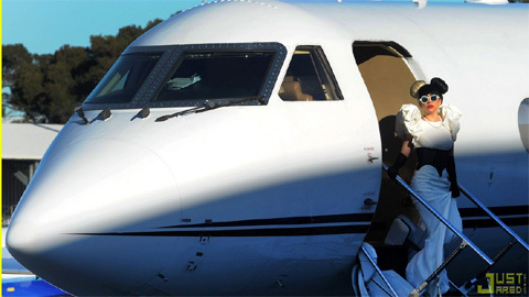 Nếu như tại Đài Loan cách đây vài ngày, Lady Gaga trình diễn một mái tóc màu xanh lét hay hoá trang giống một con gấu trúc thì kỳ này cô nàng giới thiệu kiểu tóc độc nhất vô nhị với hai búi tóc to trên đầu mang hai màu đen - bạch kim cho đúng với phong cách của "chuột Úc". Khá thú vị là màu sắc cô chọn rất ăn nhập với màu của phi cơ riêng.