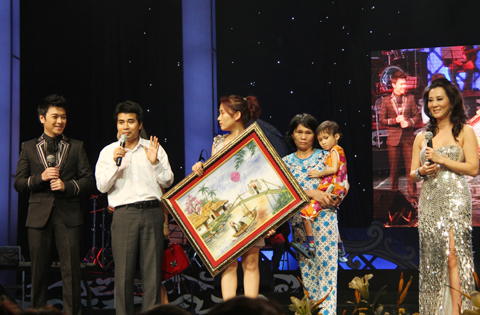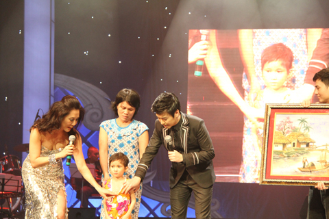 Ông bầu Hoàng Tiến (áo trắng) - người nghĩ ra ý tưởng màn đấu giá quyên tiền cho bé Mỹ Tâm và bạn Việt - người thắng nhận bức tranh đấu giá với mức 80 triệu đồng.