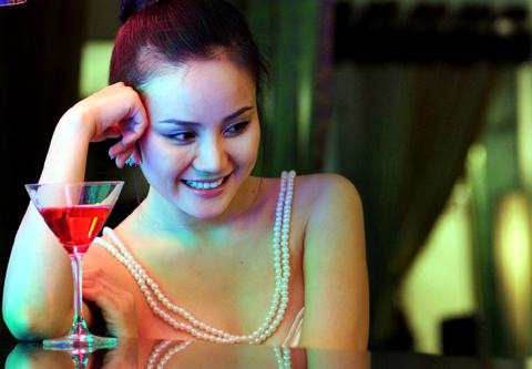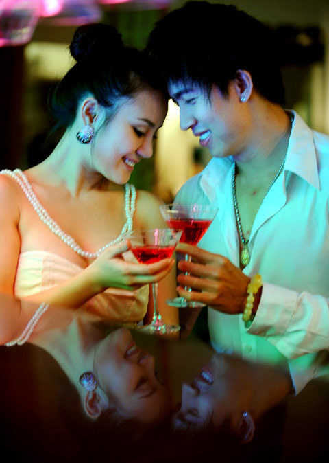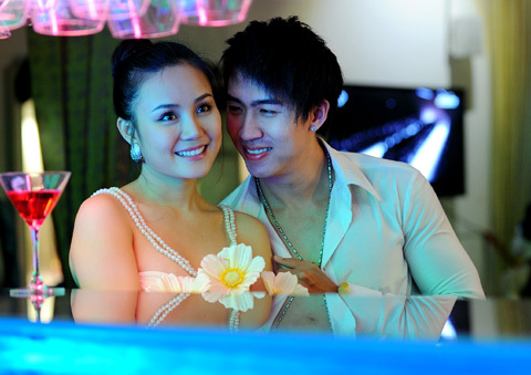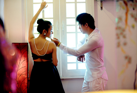 Với chiếc váy giản dị hai màu đen trắng nhưng cúp ngực khá táo bạo, người đẹp Vy Oanh trở nên hết sức gợi cảm bên cạnh một chàng "bạch diện thư sinh". Dưới ánh sáng tự nhiên xuyên qua cửa sổ căn phòng, làn da trắng nõn nà của nữ diễn viên - ca sĩ gốc Phan Thiết càng trở nên nổi bật.