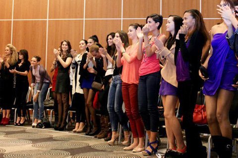 Thúy Vy (đứng thứ 3 từ phải sang) đang cổ vũ các thí sinh trong buổi thi sơ khảo tài năng |