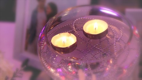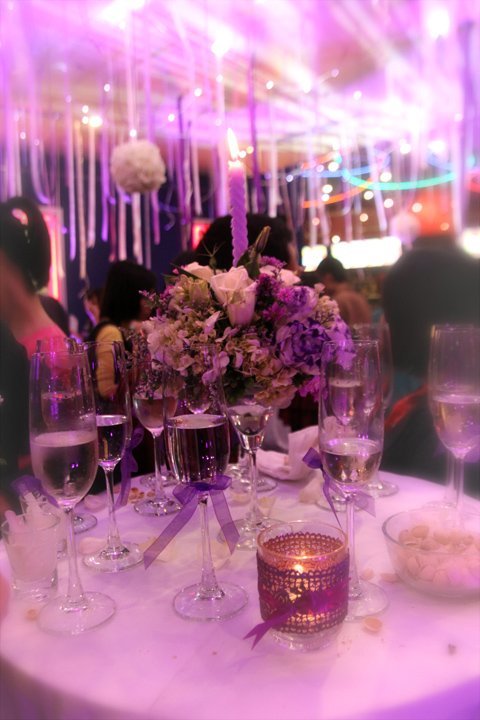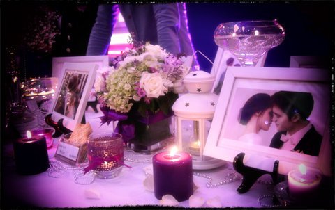 Một chiếc bàn dài phủ khăn trắng được đặt đầy hoa, nến và