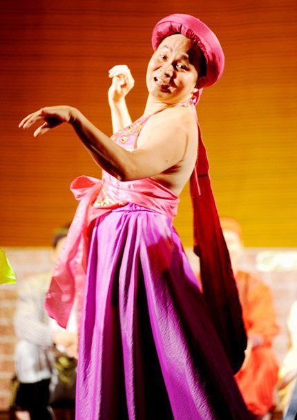 | Xuân Hinh trong một vai giả gái trên sân khấu. |