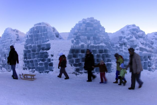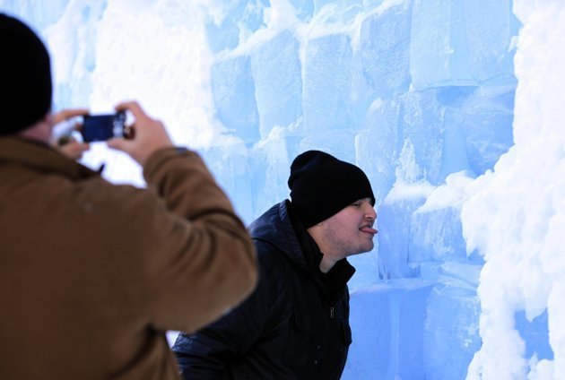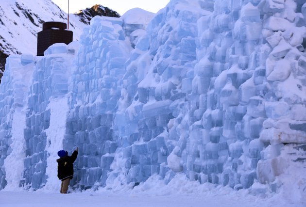 Một em nhỏ tò mò tìm hiểu bức tường băng bao quanh khách sạn.