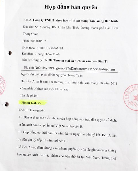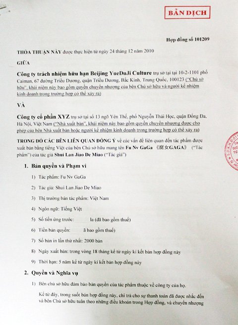 Tuy nhiên khi phóng viên báo VietNamNet tiếp cận với phía Công ty cổ phần XYZ, công ty này cũng đưa ra một bản Hợp đồng tương tự, được kí với Công ty TNHH Beijing YueDuLi Culture từ ngày 24/12/2010.