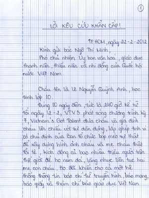 Bức thư viết tiếp: "Cháu năm nay mới 15 tuổi, là học sinh lớp 10 và là một thí sinh dự thi cuộc thi Tìm kiếm tài năng Việt Nam (Vietnam’s Got Talent). Tiết mục dự thi của cháu khi đưa lên truyền hình đã bị cắt ghép đến từng câu nói và điều chỉnh âm thanh bài hát để biến một câu chuyện của cô bé 15 tuổi đi thi hát bình thường trở nên vô cùng lố bịch, kệch cỡm, kiêu căng, đáng ghét và cực kỳ bất tài theo một kịch bản soạn sẵn của Ban tổ chức để gây scandal".