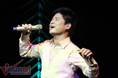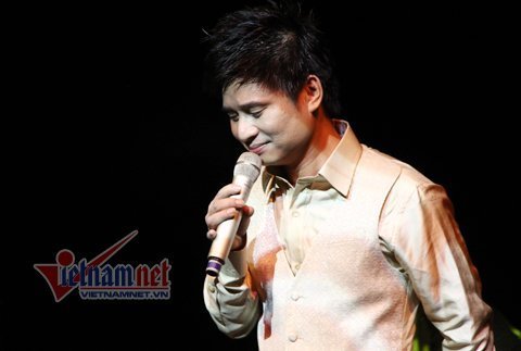Uyên Linh hát theo yêu cầu, Tấn Minh ngồi trên sân khấu cổ vũ. |