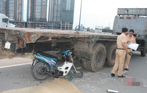 Tại hiện trường, xe gắn máy biển số 53X5-2918 găm đứng vào đuôi một xe thớt (loại chở container), bên cạnh là thi thể một người đàn ông với vũng máu.
