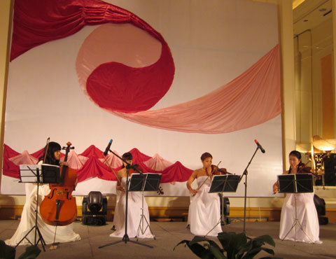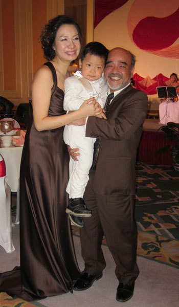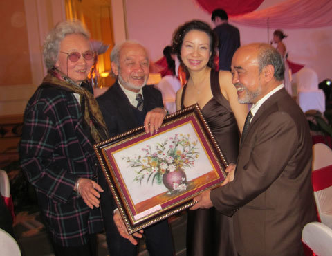 ![]() GS Đặng Hùng Võ, cô dâu Hồng Ánh và cu Tít (con riêng của Hồng Ánh). ![]() Phông lớn trên sân khấu được một người bạn của GS Võ vẽ tặng ![]() |
