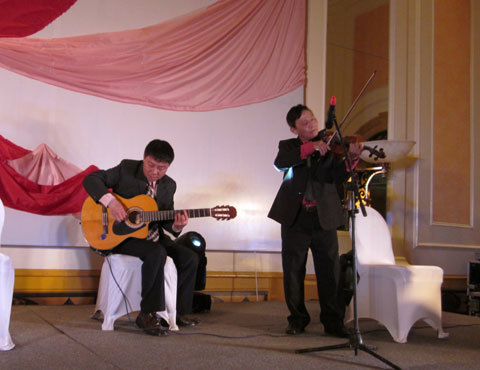| Hai người bạn của GS Đặng Hùng Võ chơi Guitar và Violon. |