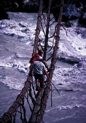 | Gần thị trấn Ghasa trên dãy Himalaya của Nepal hiện có một cây cầu treo cổ kính và rất nguy hiểm, bởi nó cao chót vót trên đỉnh núi, nhìn xuống, dòng sông thu nhỏ bé tẹo. |