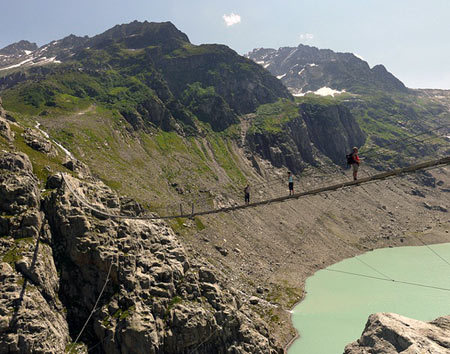 Trift Lake là cây cầu treo rất cổ kính và nguy hiểm, dài tới 165m, cao 90m trên hồ Trift Lake thuộc miền Trung Thụy Sĩ, được tôn vinh là cầu treo dài nhất trên dãy Alpes.
