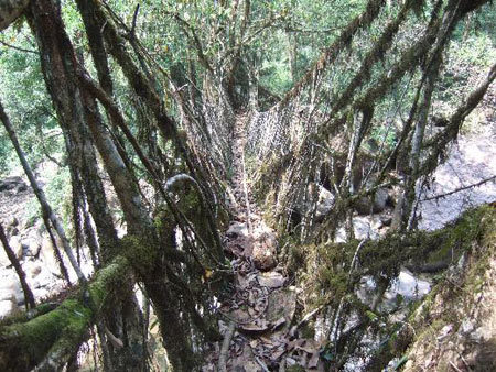 | Hiện nay tại Ấn Độ người ta vẫn đang dùng một chiếc cầu treo rất thô sơ mà mang tính kinh tế, được “xây dựng” hoàn toàn từ rễ loài cây rừng sống có tên là Banya, rễ dài và rất bền, kết lại với nhau. |