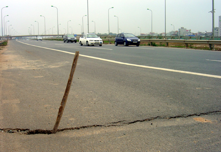 | Vết nứt ngang trên Đại lộ Thăng Long - (Ảnh: Lao động) |