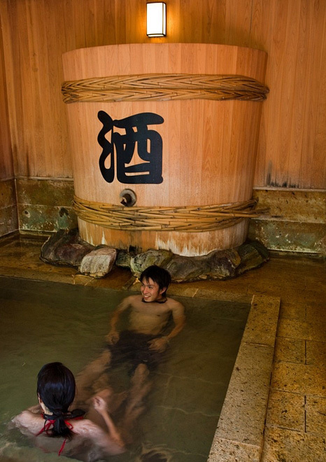 Ở Nhật, ngoài việc tắm nước ấm thông thường, còn vô vàn cách thư giãn khác như ngâm mình trong rượu vang hay sake, tắm với mì và cả 1 thùng chocolate...