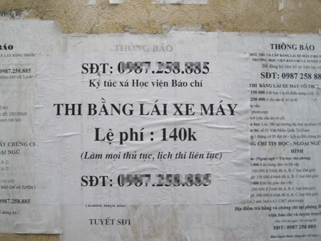 Trên khoảng trống của các bức tường có đông người qua lại những tờ rơi có nội dung hấp dẫn kiểu như: Làm bằng lái xe máy vô thời hạn, làm sớm lấy bằng sớm hoặc làm bằng lái xe máy không cần học chỉ cần đi thi là đỗ… được dán chồng chéo, vô tư lên nhau. Thậm chí dịch vụ này còn được phát triển đến tận lớp học, phòng trọ của sinh viên ở trong kí túc xá.